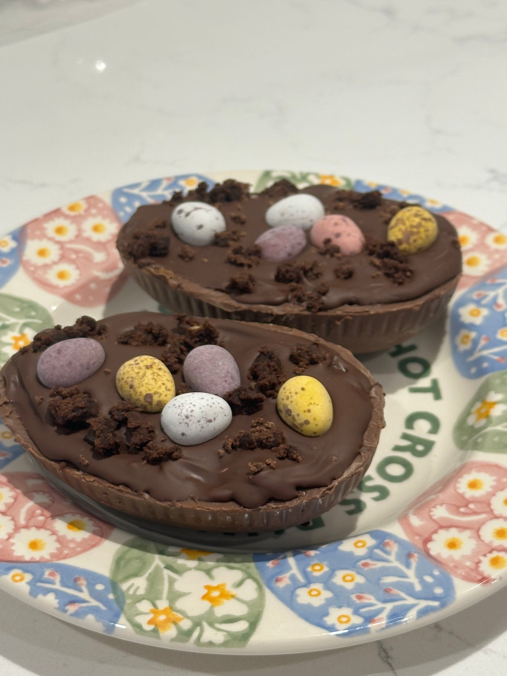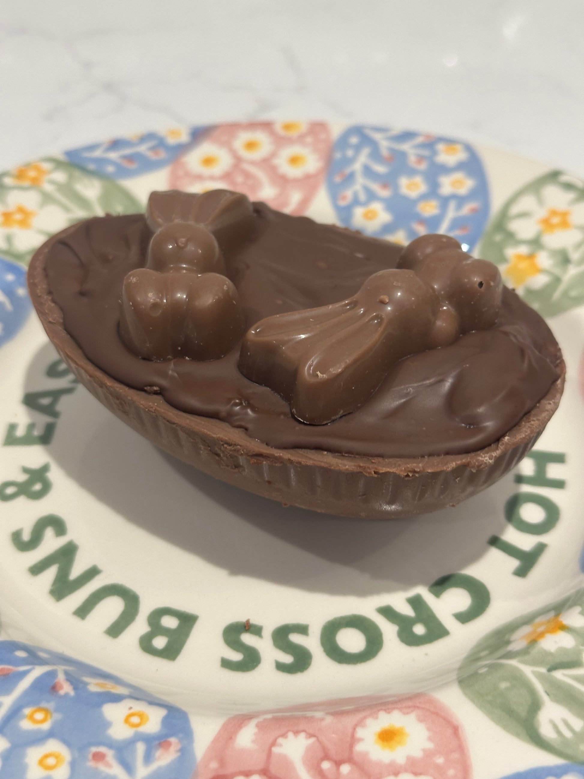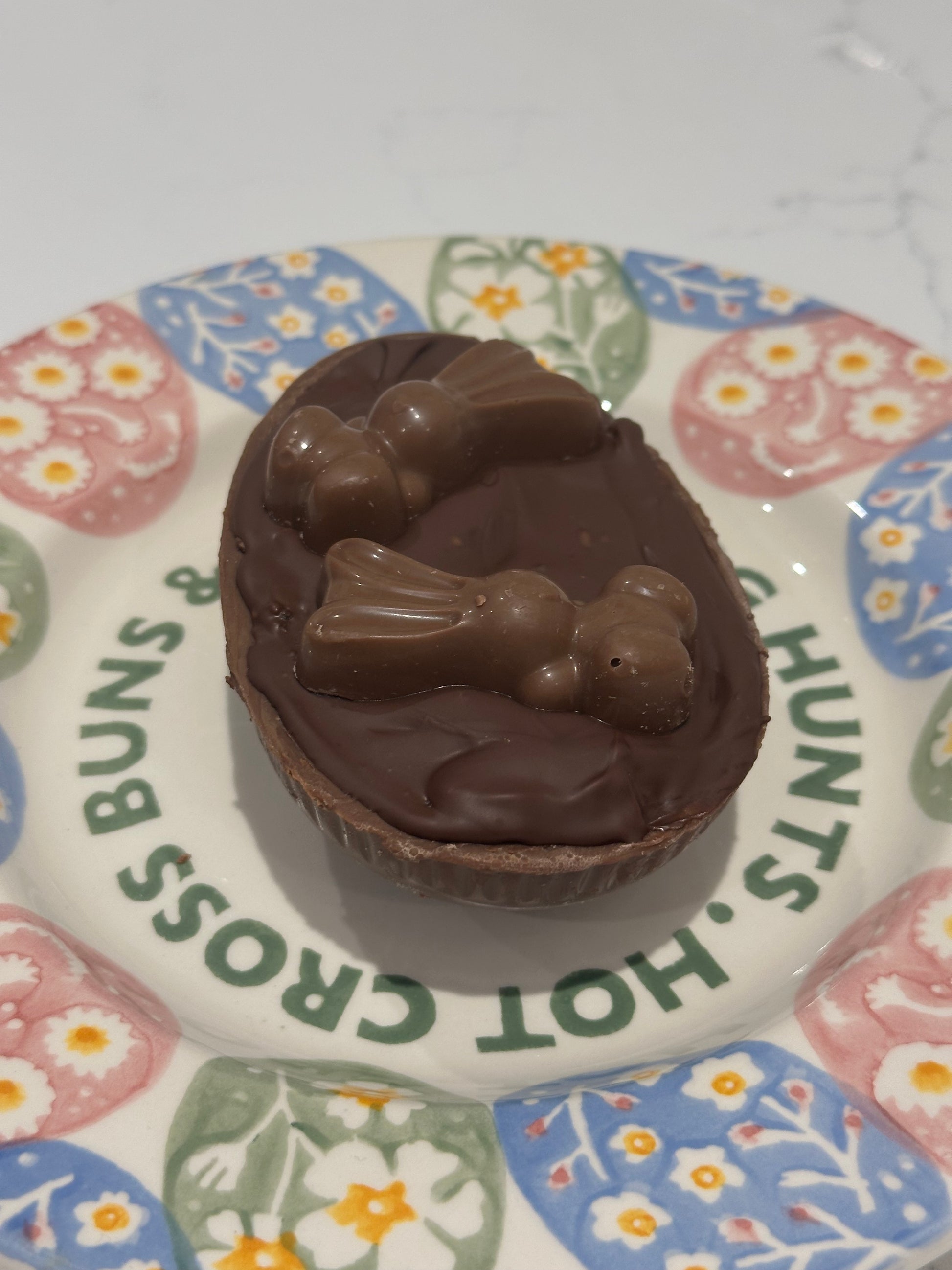 • Toppings: Each egg is sealed with a thick layer of creamy milk chocolate and finished with your choice of Mini Eggs or a Chocolate Bunny.